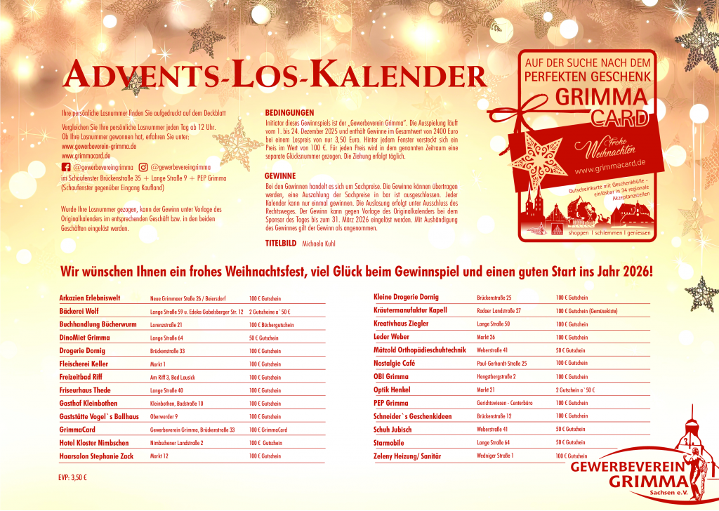 Auch in diesem Jahr bringt der Gewerbeverein Grimma mit dem beliebten Advents-Los-Kalender festliche Spannung in die Vorweihnachtszeit. Hinter jedem Türchen wartet ein attraktiver Sachpreis im Wert von 100 € – insgesamt verlosen wir Gewinne im Gesamtwert von 2.400 €! Wie letztes Jahr haben Sie die Möglichkeit eine GrimmaCard im Wert von 100€ zu gewinnen!